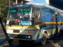Minivans emerged in large numbers in the late 1990s like those pictured above, to fill in gaps in mass transportation. Some routes duplicate the BMTA bus routes more or less, whereas others serve people commuting to and from communities outside Bangkok which are not served by the BMTA buses. Some take the expressway. These minivans are faster because they fill up quickly and stop picking up passengers when they are full. There are 3 or 4 rows of seats in the back (usually 4), each carrying 3 people, plus two more can fit in the front seat. If you have long legs, then you may fit only in the front. It's a little bit tight but worth it. Some of these buses simply wait until they fill up before their leave their origin. Others will fill up partially, and after a measured amount of time waiting (they operate in teams of vans) they will depart and then try to pick up riders from the next few stops or all along the way. When full, they zip on. But if someone gets off, then they start hunting for another rider. During rush hour, you usually need to get on at the origin of a van. During non-rush hour, you can often wave one down, and it may be half empty. The only way to know where they're going is usually by reading their big sign on the dashboard (which they reverse when they turn around) or else the writing on the side of the van. It's almost always in Thai only, no English. Some operators call out their destination over a loudspeaker at the point of origin. (In my opinion, if you live or work in the same place regularly, then you should be able to read those words in Thai.) The fare varies, typically between 20 and 30 baht. Payment is sometimes the opposite of the big city buses -- you pay the van driver when you exit, usually. Some expressway van cars (like near our office) fill up at the origin and do not take on passengers along the way, so it has become a convention for the people in the back row of seats to put their money together, then hand it to someone in a seat in the next row, and on to the front, i.e., the passengers pass their money around on an honor system, and it eventually makes its way to the driver. Our office is located near a minibus origin/destination center, Muang Thong Thani. The minibus gets on the expressway near our office and gets off at the Victory Monument expressway exit, then parks there by the entrance ramp for passengers going in the other direction. Since Victory Monument also has a skytrain station, as well as being Bangkok's main bus hub, it makes it quick and easy for our employees to go between home and office by cheap public transport, quickly. Likewise, it's preferable to driving and finding a parking space. Even though our office is located by the expressway, it still costs money in expressway tolls, petrol and parking. Better to take the expressway van car to the skytrain station. (These minivans are supposed to be registered with the BMTA, and those with yellow plates generally are. However, more than half of the minivans are operated "privately". In mid-2000, there was the first hiccup in service as authorities started cracking down on private minivans who did not pay their concession fee, and then there was a strike as the private minivans complained about alleged bribes and protection payments they had to make. There had been several warnings. It inconvenienced commuters for a day and hit the press, and from what I can tell was resolved fairly quietly behind the scenes in the usual Thai compromising way.) News as of October 2004: In the Thailand Guru section on public transportation, it has been pointed out to me, correctly, that the website was in error when it reported that the expressway crosses the skytrain at only one point, Victory Monument. Obviously, it also crosses where Sukhumvit becomes Phloenchit. This is relevant for people who prefer to live in the suburbs and take public transport in the form of minivans down the expressway to a skytrain station. Victory Monument is a bus and minivan hub -- clearly the biggest in Bangkok -- and numerous buses and minivans get on/off the expressway right there at the huge double-ringed roundabout designed for bus transfers. As the skytrain also stops at Victory Monument, it has become an even more prominent public transport hub. That's the only skytrain-expressway link previously covered by the Thailand Guru. At the Sukhumvit-Phloenchit skytrain intersection with the expressway, there is no such capability, nor could there ever be, as the area is fully developed with no space for it. Nonetheless, I went there to see if any buses or minivans got on/off the expressway at Sukhumvit. Precious few did. The main service is a set of minivans parked at the CalTex petrol station beside the Phloenchit skytrain station. These go to (1) The Mall Ngam Wong Wan, (2) Muang Thong Thani (www.MTTBKK.com), and (3) Sai Mai. They end early, some destinations before 7pm.